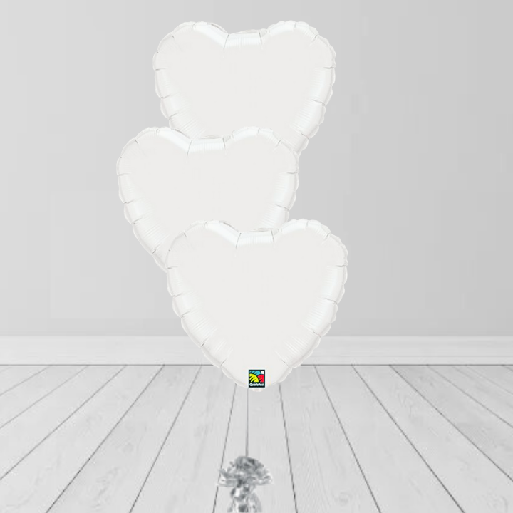 3x 18″ heart shaped foil balloons in white ties together to n a weight