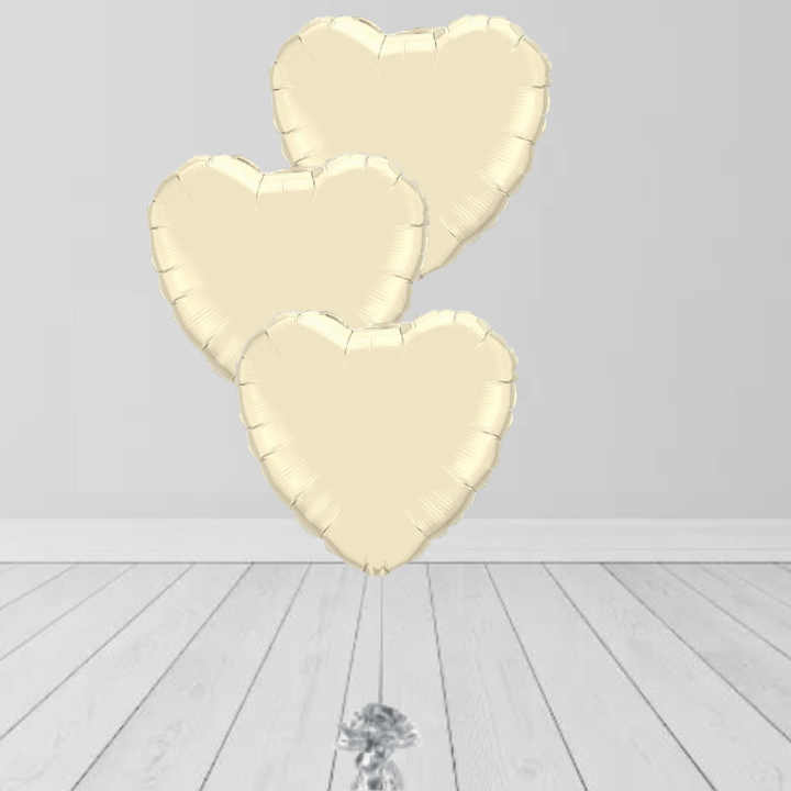 3x 18″ heart shaped foil balloons in a cream colour held by a weight