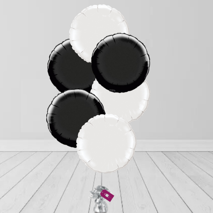 6x 18″ round foil balloons black and white held on a weight
