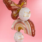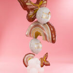 24″ butterfly and 24″rainbow with 10″ fouls complimentary shapes and 12 inch latex balloons to compete the design