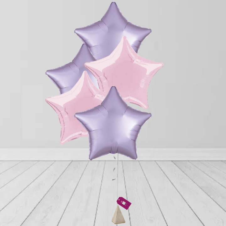 5x 18″ star shaped foil balloons helium filled on a weight Lilac and pink