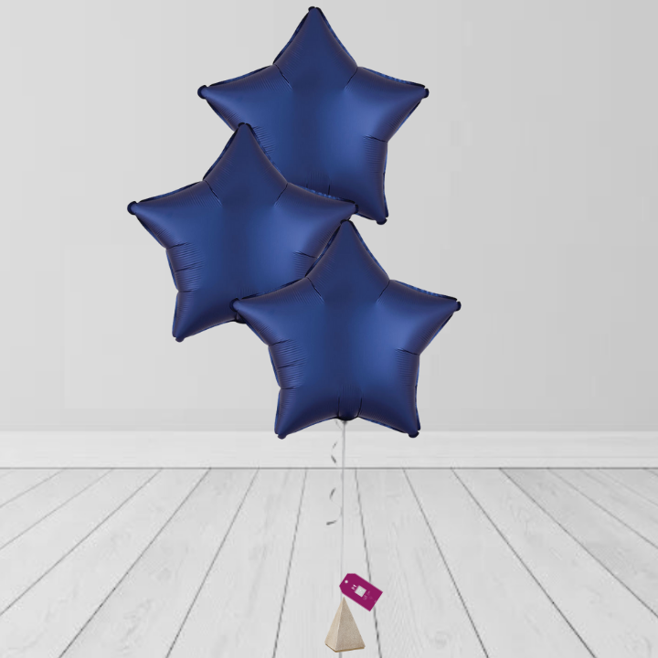3x 18″ star shaped foil balloons helium filled on a weight Navy Blue