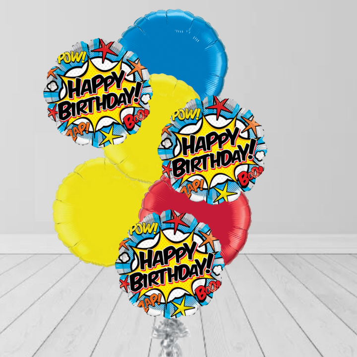 Super Hero Yellow and Blue Round Foil Balloon Bunch
